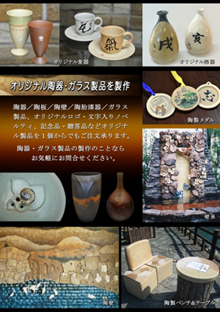陶器/陶板/陶壁/陶胎漆器/ガラス製品、オリジナルロゴ・文字入りノベルティ、記念品・贈答品などオリジナル製品を1個からでもご注文承ります。 陶器・ガラス製品の製作のことならお気軽にお問合せください。