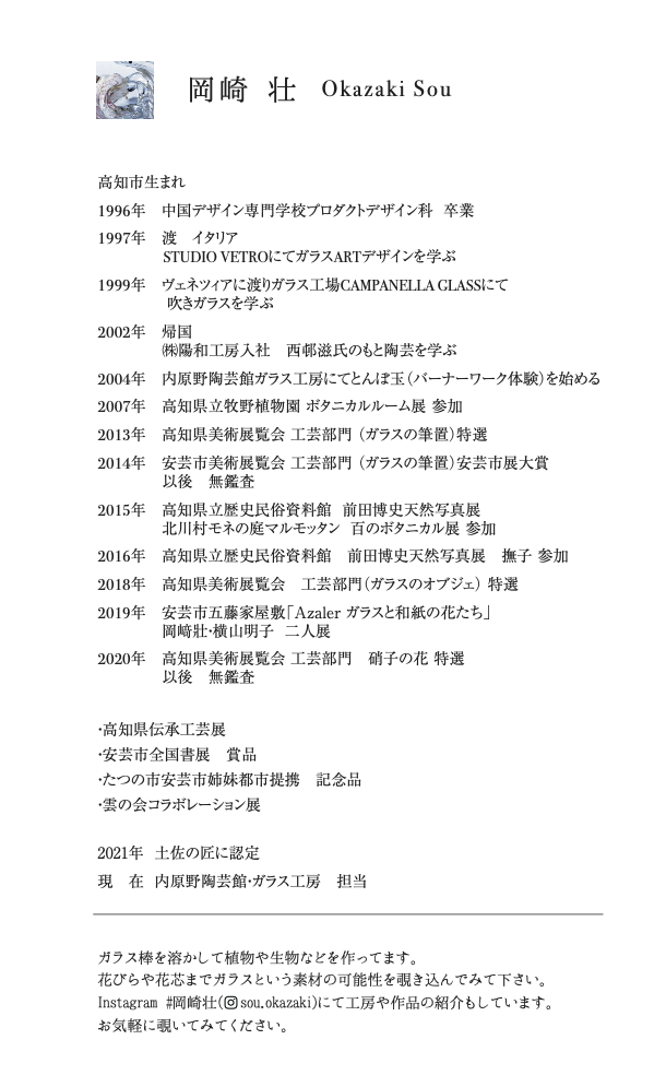 ガラス工房にてバーナーワーク(トンボ玉・ガラス細工)講師をしながら、高知県展や様々な展示会に向けて、工芸作品を作り続けています。新しい手法やデザインの開発に向け、頑張っています。▶2011年高知県展 褒状 受賞