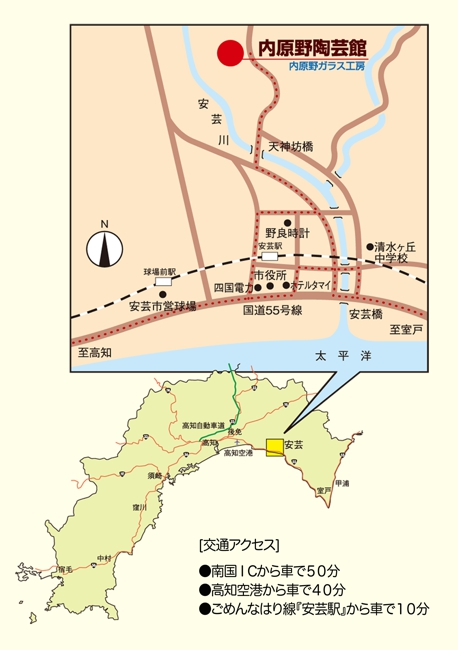 (株)陽和工房 内原野陶芸館〒784−0044 高知県安芸市川北乙1607−1TEL (0887)32−0308FAX (0887)32−0309※体験教室等のご予約はお電話又はFAXでお願いします。 水曜日が定休日なので、翌日(木曜)のご予約の確認が遅れるため、メールでのご予約はご遠慮下さい。※お急ぎのご用件等は、お電話にてお願い致します。※ 団体の方は予約をお願いします。